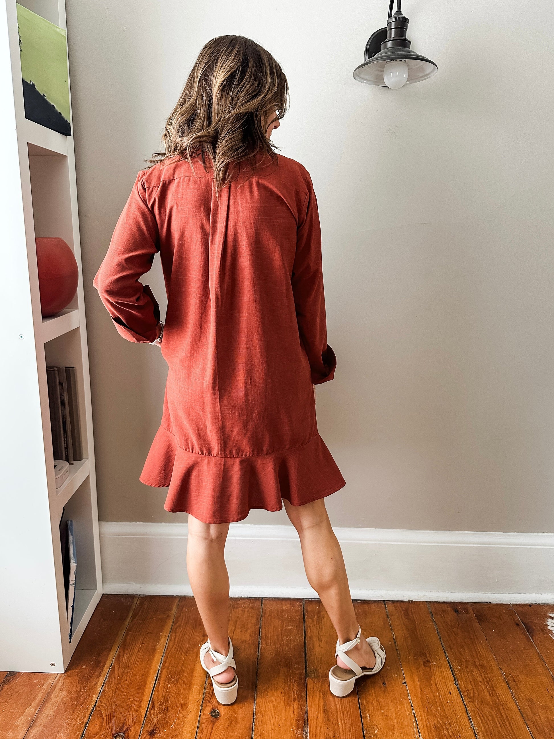This versatile linen shirt dress effortlessly transitions from casual daytime wear to elegant evening occasions. Perfect for wedding guests, family photos, or everyday style, it features a flattering button-front design with a feminine ruffle bottom that adds movement and charm.