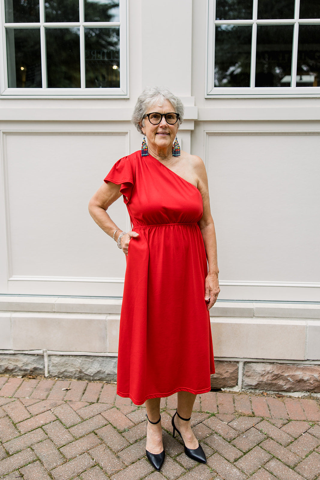 Dressy and dramatic, this one-shoulder dress has a flowy flutter sleeve and matching belt to cinch you in at the waist. This pretty midi is perfect paired with heels, flats, even sneakers!