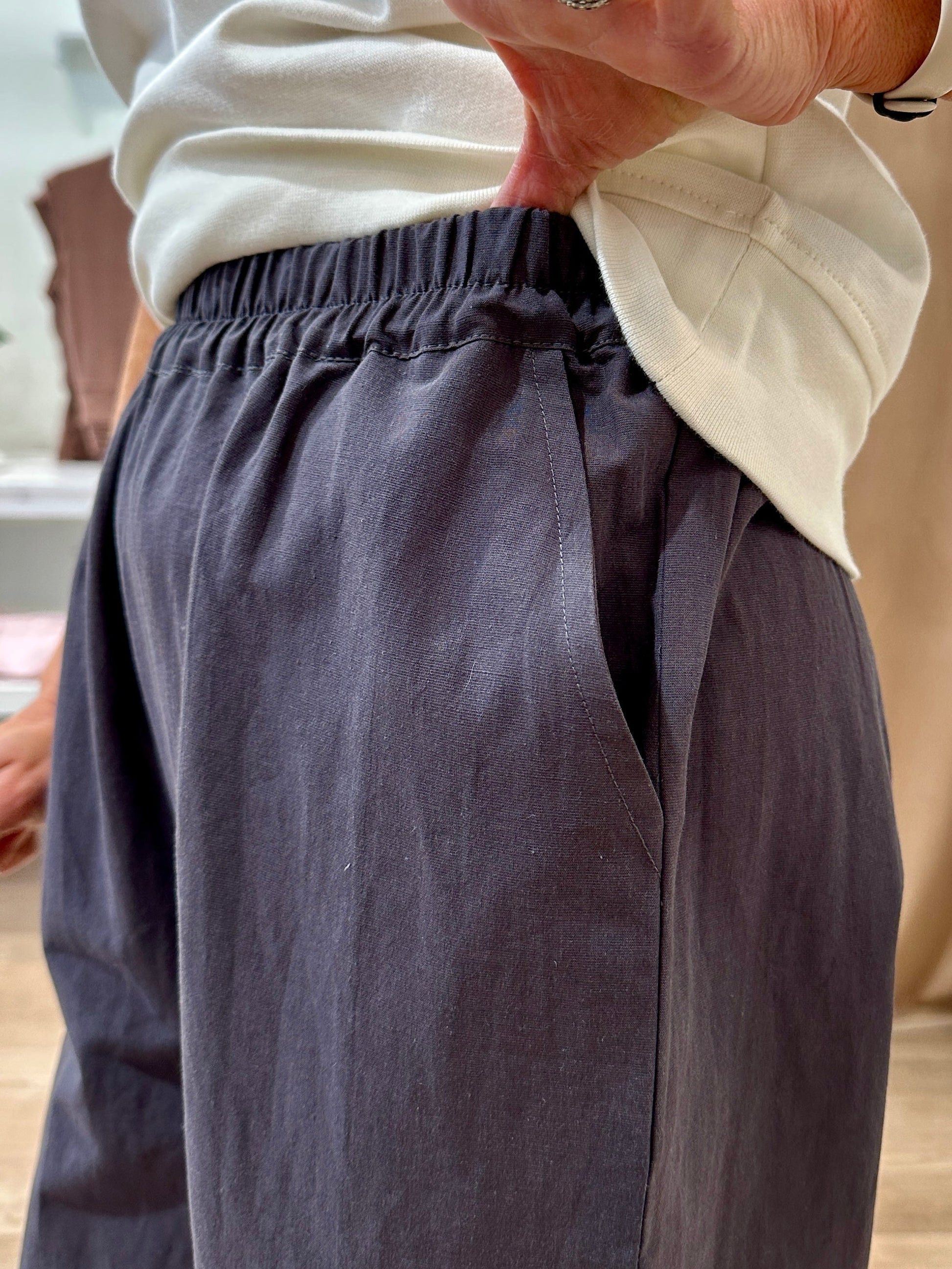 Effortlessly versatile, these pull-on linen pants transition seamlessly from casual weekends to polished workdays. Crafted from linen-cotton blend fabric, they feature a comfortable elastic waistband, relaxed straight-leg fit, and practical side pockets. The lightweight, breathable material keeps you cool while finished French seams ensure lasting quality. Perfect for the eco-conscious woman who values both style and comfort in her everyday wardrobe.