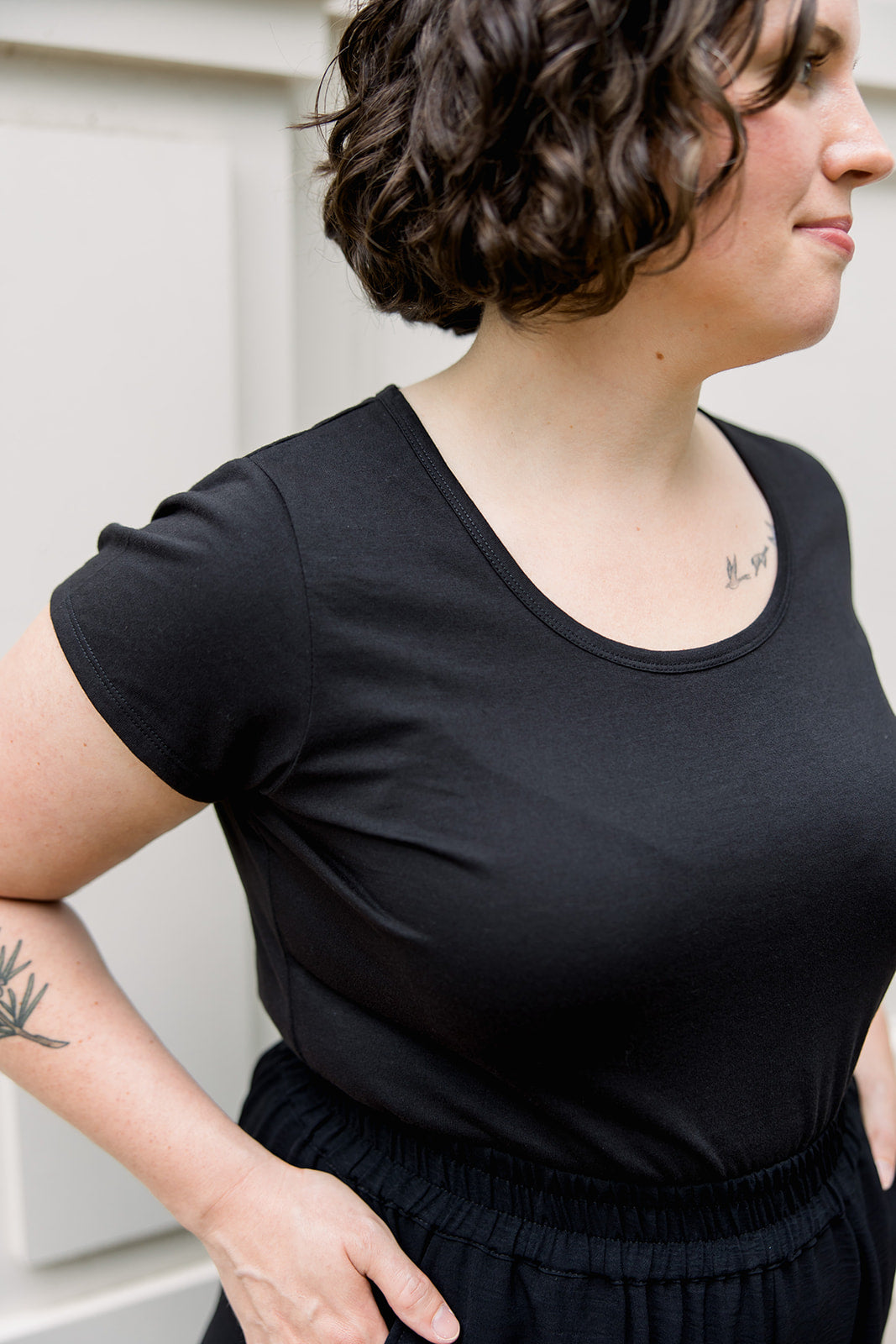 Sleek short sleeve bodysuit with a flattering fit. Perfect for layering or wearing on its own for a polished look.