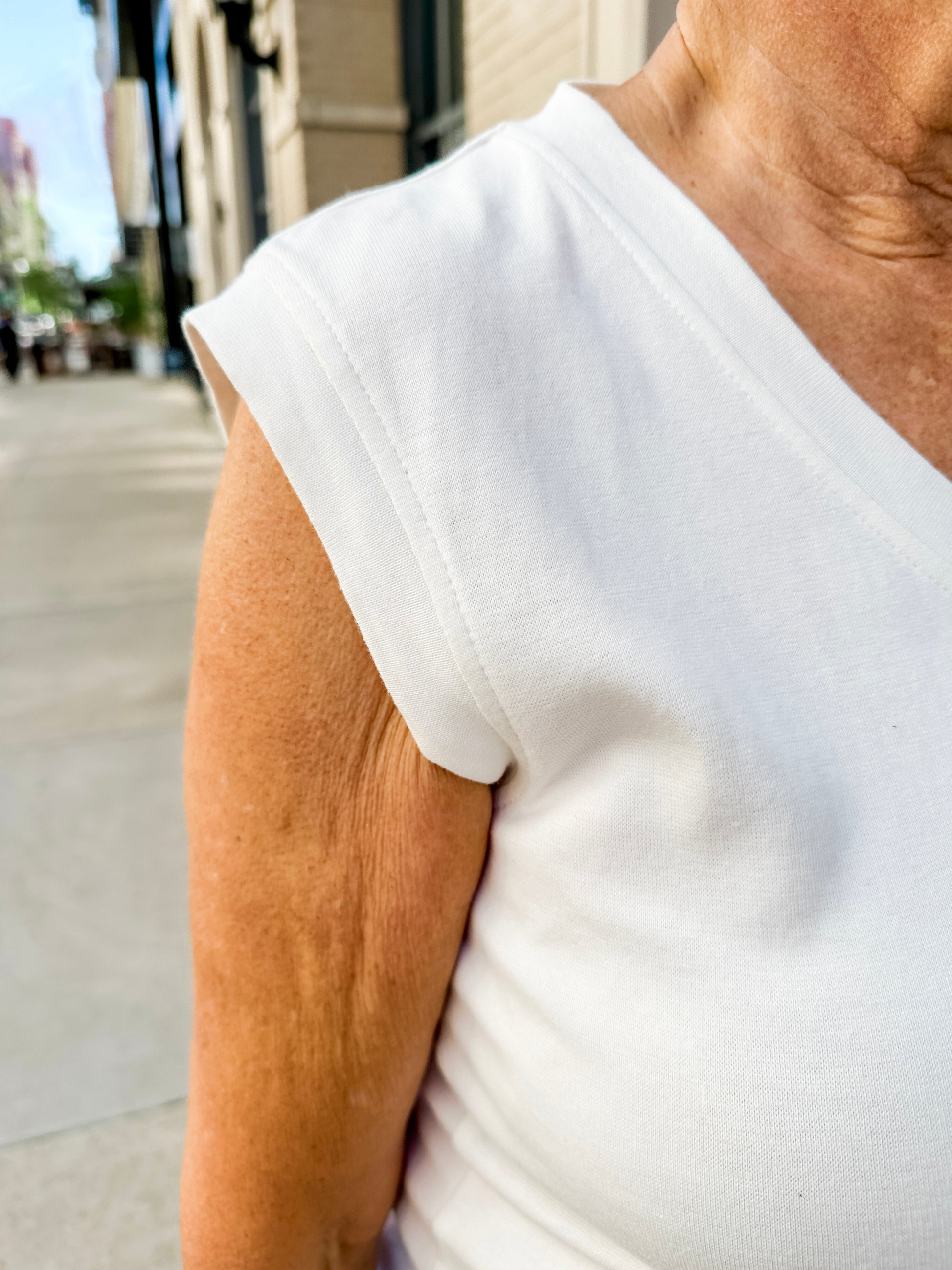 - Finished band hemline, armhole cuff, and V-neckline